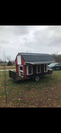 Imagine being ready to set up at roadside or flea market in a jiffy. Just park and raise the side panels/ roof and ready for customers. Portable red barn built on metal trailer and metal frame. Both sides built with fold down roof to latch during transportation. Easily quick setup. Left side has 3 doors with double shelf for hauling small animals like chickens or rabbits, right side has 3 doors with taller hutches for larger animals like turkeys. Center bottom has open space large enough for hauling goats or sheep size animals. Loft could store hay and such. Built for setting up to sell farm animals, eggs and such but never used. Text to make arrangements to come see today. No google codes.