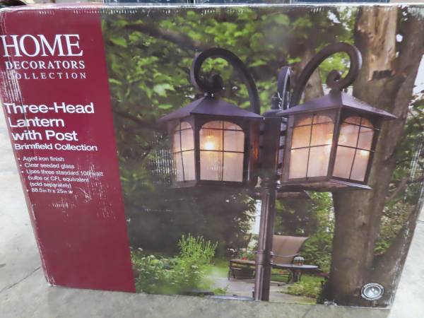 Home Decorators Collection Brimfield 88.5 in. Aged Iron 3-Head, 3-Light Outdoor Post Lamp with Clear Seedy Glass Shade. This is a new, open box item.