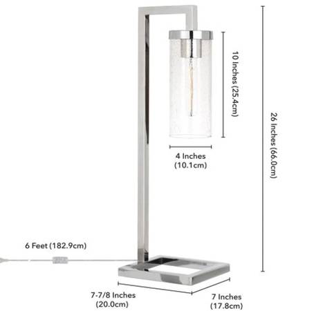 Illuminate your space is clean, modern style with this 26" desk lamp. Crafted of steel in a neutral metallic finish, this lamp strikes a clean-lined hook-shaped silhouette on an open square base. Suspended from its arced top, a glass cylinder shade diffuses ambient light as it’s dispersed throughout your space. Powered by a 72" electric cord, this floor lamp is operated by a simple on/off switch.